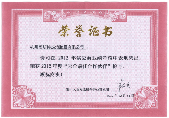 2012年度,福斯特在天合光能供應(yīng)商業(yè)績考核中表現(xiàn)突出,榮獲2012年度“天合最佳合作伙伴”稱號。